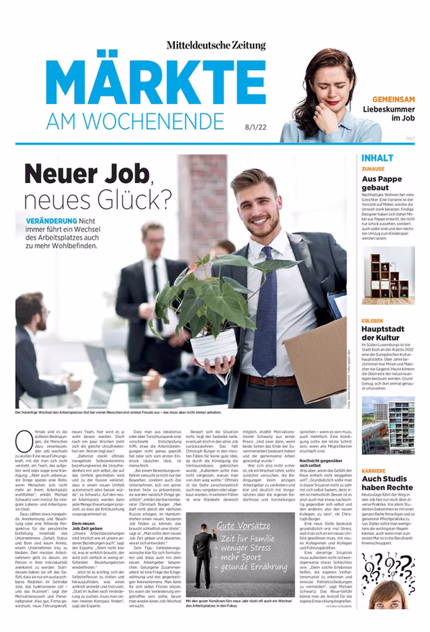 Frische Ordnung in den Rubriken bringt mehr Spaß beim Lesen: Eine modern gestaltete Titelseite eröffnet die Märkte am Wochenende und präsentiert sich mit einem aktuellen Leitthema aus unseren Themen Karriere, Mobiles, Zuhause, Erleben oder Gemeinsam.